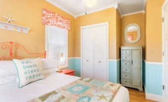 Upstairs, you’ll find three bedrooms thoughtfully arranged for comfort and privacy, along with a full bathroom. Each room has a queen bed and provides a quiet space to rest after a day at the beach. One of the bedrooms has an en-suite half bathroom.