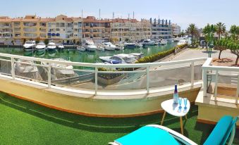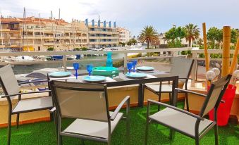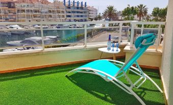 T2 with large terrace overlooking port, canal, sea. Shops, restaurants, beach on foot