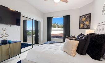 Guest Bedroom #1 features Queen Bed, large closet 55in TV, wireless charger for phone and views of the backyard and pool