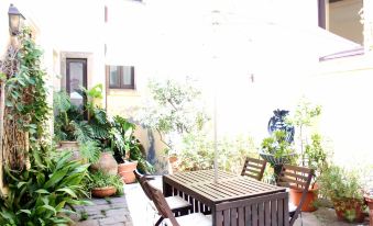the apartment is roughly 20 mins from the airport, so 10 mins on Alibus ( train not a good alternative) to Centrale then 8 mins walk to apartment.. Comfortably furnished, v good AC , large bedroom, well equipped kitchen ( includes washing machine not listed) small garden /terrace in sun in day shaded from late afternoon. Ettore lives on site, a mine of information and support. Lots of good restaurants within 400 metres, plus b