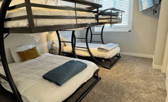 The master suite features a luxurious king bed, while the two other main floor bedrooms offer queen beds. Downstairs, a bunk room is ready for kids and adults alike, featuring 2 double beds and 2 twin beds. The other basement bedroom has two twin beds. All of the basement windows are above ground level giving the basement plenty of natural light as well as views of the well maintained yard. Outside, the fenced backyard invites fun and relaxation with its lush lawn, fire pit with seating, and a dining area perfect for outdoor meals. Parking is a breeze with a three-car garage and additional space on the concrete side pad. Inside, family gathering areas include large streaming TVs to keep everyone entertained.