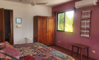 Step inside to an open-concept kitchen, dining, and living area with colorful decor and artisan-made furniture. The upstairs master and guest bedrooms open onto a large ocean-view balcony with cushioned loungers—ideal for relaxing with a book or watching the waves.
