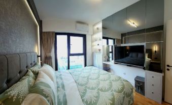 This luxurious 50m2 one-bedroom apartment is brand new, with modern furniture, and is fully equipped. The main space consists of a beautiful and spacious living room that connects with an open space kitchen with a dining table. Also connected to this space is one of the top-tier amenities of this apartment, the terrace with the most amazing view! The bedroom has a very comfortable queen-sized bed, a Smart TV for your free time and a big wardrobe for all your stuff. Right next to the beautiful bedroom is the spacious bathroom, with all the essentials: towels, a hair dryer, toiletries, shampoo, conditioner, and soap. Next to the bathroom is the utility room in which you'll find the all-in-one washer dryer, vacuum cleaner, iron, ironing board, and drying rack. Also, there are a few cleaning supplies here if needed. The building has a reception with a professional concierge service and private parking in the same building. There's also a 24/7 security service on the premises.