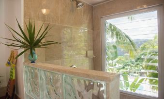 Both studio apartments are located on the lower level of the main house, and just above a beautifully landscaped hillside and large pool deck. While the two units share the same level, they each have their own well appointed kitchenette, dining table, sitting area, TV, and beautiful bathroom. Each kitchenette has a two burner electric top stove, refrigerator, coffee maker, toaster and microwave. The units share over 1000 square feet of exterior decks space with stunning views over Coral Bay and BVI, outdoor grill, hot tub garden, and large pool deck. Each of these outdoor amenities provide plenty of areas around the estate to lounge alone or in a group.