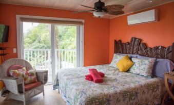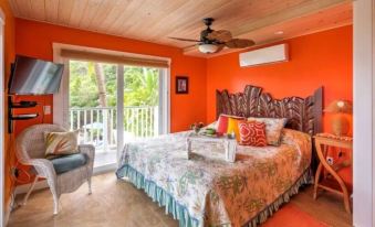 Suite Papaya sleeps two comfortably with an option to add one more guest; it features a King bed, pullout sofa, platform daybed mini-room, A/C, and faces both south and west, capturing stunning sunsets.