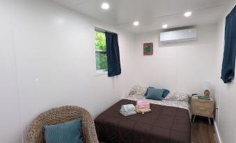 Our family glamping site with AC is new this season! Two seperate container rooms each with a queen matress, fresh linens and towels will be waiting for your arrival. One conatiner has an additional twin mattress, and the other has room for a twin air mattress for a 6th guest. A TV, recessed lighting, air conditioning and small fan are in both containers for your comfort. The family site has a large deck with 4 adirondack chairs and table connecting the two rooms.