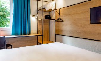 L'hotel si trova in buona posizione ad una dozzina di chilometri dal centro di Tours. Ampio parcheggio e area verde esterna ben curata. Personale molto cortese e disponibile. Camere disposte a piano terra in lunga sequenza lungo un corridoio centrale. Arredo moderno ed essenziale ma spazi davvero minimi: nel lavandino non entra un braccio e in due è difficile non ostacolarsi nei movimenti. Ottima la pulizia (ma una scopa resta dimenticata in bagno...). Colazione dolce e salata apprezzabile. Servizio ai tavoli per la cena veloce e attento: buono il menu proposto ai gruppi. Ampia l'area relax con comode poltrone e divani e persino un calcio-balilla!