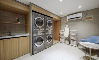 三人房很大,樓下可以免費停車,離江南環球港很近,吃飯購物都很方便。還有烘乾機和洗衣機。前台服務態度也很好。