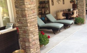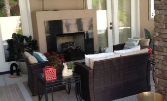 Detached guest suite has full bath, plenty of closet space ,full view of pool ,45” smart tv with YouTubeTV, WIFI, outdoor kitchen with gas cooktop ,microwave, and full size refrigerator. Separate entrance.