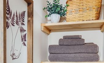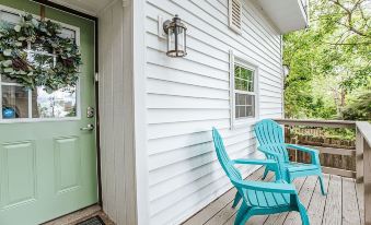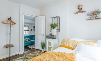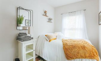 Home includes private parking off street, plus private entry and porch. The interior has 2 bedrooms and a combined kitchenette-living space. Sofa in living room can be converted to bed for extra sleeping space. Bar top table in living room doubles as work space with extra USBs and outlets. Smart TV includes access to all your favorite apps. You won't want to cook with so many restaurants within walking distance! But the kitchenette is stocked with everything you need - full fridge; Keurig with coffee pods, sugar, and cream; toaster; glasses, mugs, silverware, dinnerware.