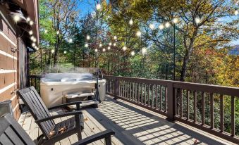 Outside, there is a large screened in porch that has two rocking chairs, perfect for watching the sunrise. There is a small table perfect for eating breakfast or dinner outside. There is also an open porch with a hot tub, perfect for enjoying the year round mountain views. Next to the screen porch, there is a grill which is perfect for grilling on a night after hiking or shopping. In the front of the home, there is a porch area that has seating with cafe lights and provides another area for relaxing. The entire front and back of the home is fenced.