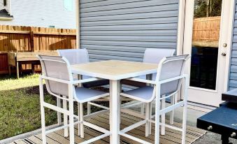Outdoor space has patio with table seating for 2 and Patio has a grill and fenced in back yard.