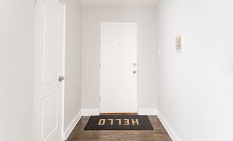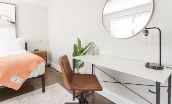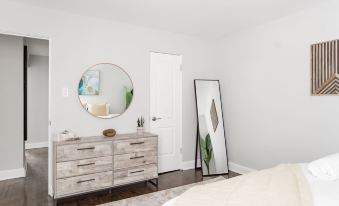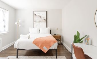 This airy and spacious apartment features two generously sized bedrooms with stylish rugs and plenty of storage. The full bathroom is equipped with a bathtub, shower, and vanity. The full kitchen comes complete with all the necessary appliances and plenty of countertop space for cooking and entertaining. The living area is well-lit and open to the dining area, which provides plenty of seating for guests. Enjoy the convenience of modern amenities like a 55" smart TV, and fast Wi-Fi.