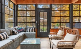 The spacious kitchen is highlighted by a large granite island, high-end appliances, and a stylish bench-seat breakfast nook. A large, cozy porch with wall-to-wall windows and fashionable couches, chairs, and a "picnic table" provides you with great views of the massive backyard and surrounding trees, making it a relaxing oasis to sip coffee or your favorite wine.
