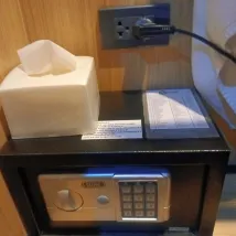 The room was lovely and well-appointed, featuring a soft bed, effective air conditioning, and excellent water pressure. However, parking was somewhat limited. In terms of amenities, a hairdryer and coffee were missing, though earplugs were provided. A major plus was the abundance of power outlets, which made charging devices very easy. There's a rule against bringing seafood into the hotel to consume. I had purchased some in a box, but couldn't eat it on the premises, so I ended up discarding it, but that was fine.
