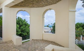 Inside, the Moko Jumbie House - Historic Suite, it welcomes you with a charming kitchenette showcasing historic Danish brickwork from countertop to ceiling, framing the beautiful large windows. The bathroom is a retreat in itself, featuring floor-to-ceiling Carrara marble, a sleek glass shower, and a serene view of private greenery. With a split A/C unit to keep you cool and all your essentials covered, this suite blends historic charm with modern comforts.