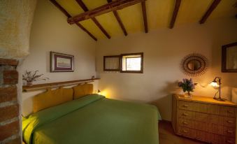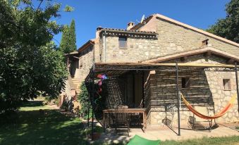 On the first floor of the farmhouse, consisting of bedroom, living room with kitchenette and bathroom with shower. The apartment has been renovated respecting the original building materials, handmade tiles and tiles and chestnut beams. Bright and well furnished, it enjoys an excellent view of the hills. It has a covered terrace for eating and green spaces.