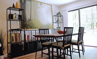 Living room, dining room and kitchen are an open floor plan with comfortable spaces for relaxing, dining and cooking up a great meal. Large screen TV with netflix, amazon and hulu as well as DVDs galore - plus a record player with plenty of vintage vinyl. Lots of puzzles, books and games are in the dining room and of course fast Wifi.