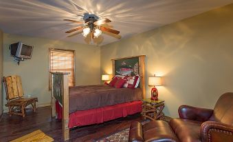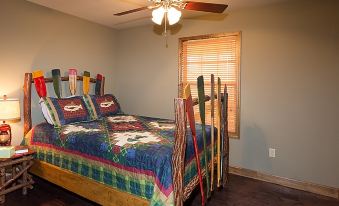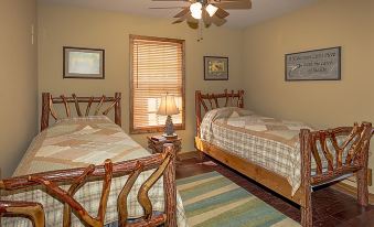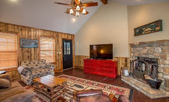 You’ll step inside and be greeted by a river themed cabin. The living room has a rock log fire place and a smart tv where you can stream your favorite shows after a long day of fishing on the Little Red River for the perfect catch of world class trout. It also includes a comfortable single pull out sleeper in the lounger to accommodate an extra guest. You’ll find the master bedroom with a queen size bed and en suite with a jacuzzi tub, two twin beds in the second bedroom, and a queen in the third bedroom. Plus a fully functioning kitchen and two bathrooms. Your family can also enjoy playing games or grilling outside at the end of the day in the spacious yard.