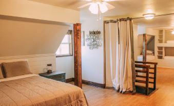 Upstairs you’ll find a loft area with a privacy curtain between a queen and 4 twin beds and a bathroom that opens up to a small, private deck.