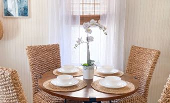 Immerse yourself in the culinary delights of this charming beach house cottage, featuring a kitchen that has been thoughtfully curated with all the amenities a foodie could want. From the sleek electric range to the modern stainless steel appliances, this space is a true chef's oasis. Enjoy the quaint dining table, perfect for savoring the morning cup of coffee or tea, while breathing in the fresh sea air.