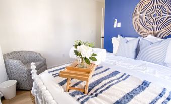 Each bedroom features opulent linens and bedding that will wrap you in a cocoon of comfort, ensuring that you'll wake up refreshed and ready to take on the day! Two of the bedrooms offer ocean views, so you can savor the beauty of the beach from the comfort of your bed. The beach-inspired decor in each room will transport you to a world of serenity, with calming shades of blue and white to evoke a sense of peace and tranquility. Whether you're traveling with extended family or coworkers, these rooms will offer the perfect retreat for anyone seeking respite from the hustle and bustle of daily life.