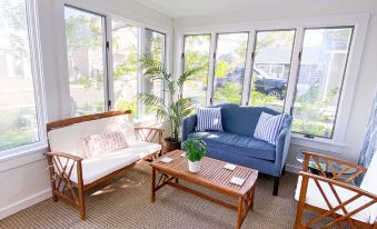 Step into the warm and inviting sunroom-- adorned with tropical wallpaper, this room exudes a feeling of tranquility and escape from the hustle and bustle of everyday life. Settle into one of the chairs or comfortable sofas, and enjoy the company of loved ones while taking in the view of the neighborhood.
