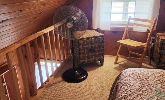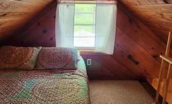 The cabin features a kitchen with a full-size propane stove, kitchen sink, microwave and full-size refrigerator. The kitchen is complete with everything you will need to cook meals during your stay. There is a small barrel-style table with four stools. The cozy living area has a futon, a chair and a Roku television so you can sign in to your streaming channel. A private bathroom with a shower, toilet and a small sink vanity, complete the downstairs. Upstairs is an open loft bedroom with a queen size bed. Make sure you check out the stairs that lead to the loft. If you have mobility problems - this will not be ideal for you. The front porch offers a swing and two Adirondak chairs for your relaxation. This is the perfect place to begin and end your day.