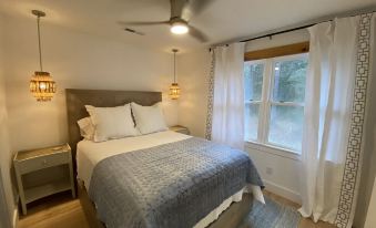 A part of the Eden at Gracefield event venue, welcome to The Ashepoo House, a charming 3 bedroom 3 bath home. ***PLEASE NOTE THIS IS A SPLIT LEVEL HOME WITH MASTER ON GROUND FLOOR AND ALL OTHER LIVING SPACES UPSTAIRS*** The most private of all the homes on this 515-acre Estate, it has a dock on a large lake, where geese and ducks flock every year. Take in the spectacular view while relaxing with friends and family on the elevated screened-in porch. Fish off the banks or paddle out on the lake and try for that “catch of a lifetime’… we’ve caught some bass as large as 15lbs in our lakes here at Eden! Recently renovated, this home is an absolute dream! Everything is brand new and well-appointed, with a King bed in the ground floor master suite as well as 2 chairs and large flat screen tv.