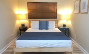 Queen beds in both bedrooms with high-quality bedding, plenty of pillows in varying firmness, and fresh linens for your comfort. There are room-darkening blinds for sleeping in while on vacation. The main bedroom has a lounge chair and desk for working remotely. Each room has a closet with hangers.