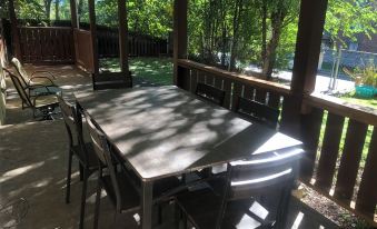 There is an inviting patio at the front entrance, table and chairs, and string lights that operate on a solar panel. The side yard is fenced and private, with comfortable chairs for relaxing after a day well spent.