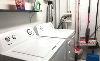 Washer and dryer in the laundry room, stocked with complimentary laundry detergent, iron, ironing board, broom, dustpan and mop.