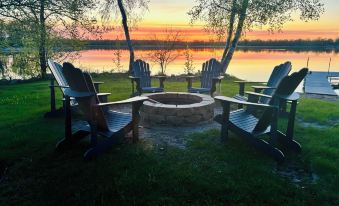 Just steps from the deck, the sandy beach awaits with 4 loungers, two docks, a swim raft with seats and slide, a boat lift, a jet ski lift, and a lakeside fire pit surrounded by 6 Adirondack chairs.
