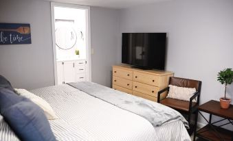 Every bedroom has a TV with Amazon Firestick streaming (Netflix, Disney+, Hulu). An upstairs living room with an electric fireplace and TV opens to a private deck, perfect for enjoying breathtaking sunrise views over the lake.