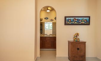 Luxury ocean front condo in an upscale mid-rise building conveniently located to the Cozumel Town Center. The condo is professionally decorated and offers all the amenities of home. The artwork and amenities are amazing. The 18’ windows aggregate a full view of the pool and the ocean. Watch the cruise ships come and go daily. Truly, everyone loves this condo! It’s extra large and roomy with a sofa bed and a trundle bed besides the king bedroom and there are two full baths. The master bedroom is elevated and there is a picture window to the ocean view. The kitchen has all American appliances and everything you need to get you started on your vacation if you wish to eat in. Coffee, creamer, tea, salt, pepper, oil spices and more including coffeemaker, toaster, blender, even a garlic press.