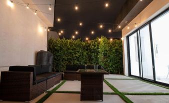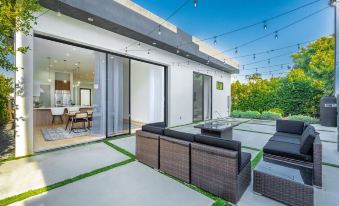 This modern home offers a private oasis outdoors where you can enjoy the famous LA sunshine. There is an outdoor patio in the back with comfortable seating, greenery, and a table that makes it easy to enjoy some drinks and food outdoors and firelight chats.