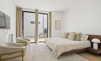✹ Primary Bedroom: Walnut, zen king-sized bed, 75” smart TV, spacious walk-in closet, lounge chairs, office space + private bathroom with bathtub
