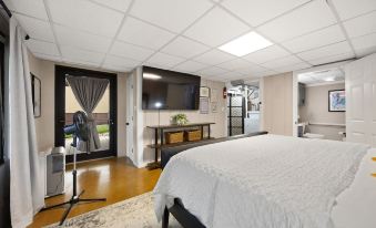 BEDROOM 2: 70” Smart Roku TV, King Bed, 2-night stands, closet, outside access to lower concrete patio with porch swing.