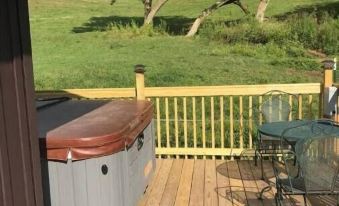 Great patio with a bistro table with amazing views of the sunrise and sunset and of course our friendly horses! You can even pet our horses from sitting in the hot tub.