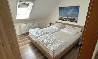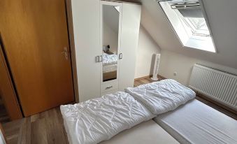 The apartment consists of a small kitchen, small shower room with window, bedroom (2 persons), a folding bed (guest bed), as well as living room and dining area. Our apartment is located in the attic of our family home, which is in a very quiet residential street (Butendieksweg). Perfect to relax. There is a separate parking space available. To the Wernerwald it is about 3 minutes walk, to the sandstrand about 10 minutes and the next bakery with shopping possibility is likewise in about 10 minutes on foot reachable.