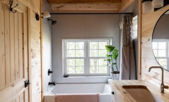 An extraordinary timber-frame tiny house perched on a wooded trail of West Brow of Lookout Mountain. Unplug from your daily drudge and enjoy the calm and simplicity of our luxurious loft, contented kitchen and deep soaker tub boasting wooded mountaintop views like no other. Tucked on the brow side of a calm rural area, you'll feel hidden in the woods, but a quick drive to local attractions, mountaintop restaurants, local groceries, farm fresh eggs, and even pasture dog boarding services. Beautiful 25 minute drive to Chattanooga.About pets:Pets allowed: dogs less than 50 lbs per pet (limit 2 pets total).About children:Adults only.About customRules:Pets are not allowed on any furniture. Pets are not allowed up in the loft. The ladder steps going up are unsafe for a pet to maneuver or be carried.Pet waste should be disposed of in the two trash bins located by the parking pad..About smoking:Smoking is not permitted.About minBookingAge:Minimum age to rent: 21.About events:No events allowed.