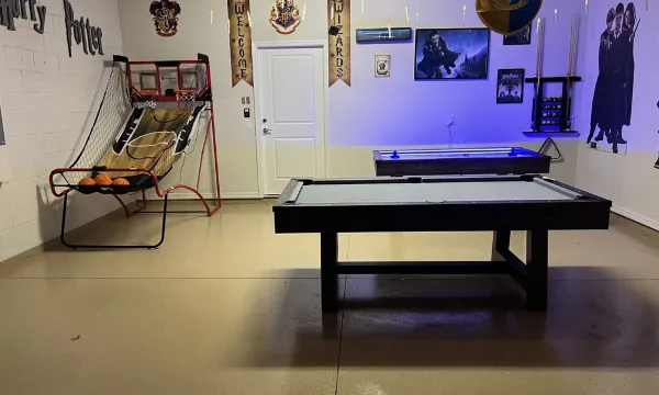 - Harry Potter themed Game room equipped with group games including 2-person basketball, Pool Table, Darts, and Air Hockey Table