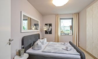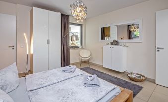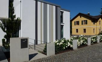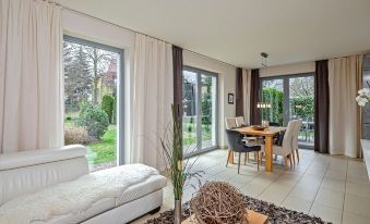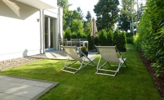With the Quartier L (= Loschwitz) we offer you a spacious, bright (south-west side) and very modern apartment (very nice living and dining area; 2 separate sleeping areas; individual furniture; overall design color concept; lights and accessories; large open individual kitchen with a view in the garden area; independent access to your living / outdoor area with terrace; parasol; bicycle stand available; LAN connection at no additional cost; baby cot and high chair; toys and games; entertainment television; key delivery via key safe; access code after booking / payment by email; underfloor heating in all rooms and with the latest energy standard) in an architect's house completed in early 2010.