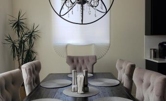 The dining area seats six and is beautifully furnished with a solid wood table and comfortable tufted chairs. There is additional seating at the island.