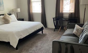 Suite one is furnished rustic leather and wood finishes, with a king bed, convertible twin sofa sleeper, perfect for kids, a desk (wireless printer available) and 55" TV. The bath features a water closet and walk in shower with wand and bench.