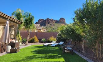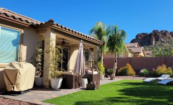 The patio features a table with seating for six, sofa sectional, swing chair and gas grill. A second patio features beautiful views of both Beehive Peak and Pig Mountain (see if you can find the pig) and a beautifully landscaped back yard with seven palm trees for a resort like feel and perfect for Arizona style outdoor living.