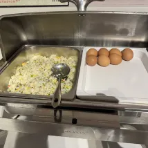 Throughout my three-day stay, the consistent items available each day included: pork buns, Dujiangyan rice cakes, plain congee, hard-boiled eggs, egg fried rice, mixed grains (sweet potato, corn, yam), cantaloupe, cherry tomatoes, various biscuits, cakes, 3-in-1 coffee, and milk made from powder.