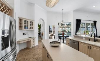 Step into our modern and spacious 5-bedroom villa, spanning over 3,200 sq ft, where meticulous attention to detail ensures a five-star stay for our guests. Upon entry, be welcomed by 13' high ceilings, an elegant lobby, lounge, and kitchen area. The fully equipped kitchen boasts premium stainless steel appliances, utensils, cooking basics, and a dining area.