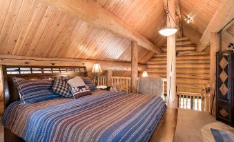 The unique log staircase leading to the master bedroom loft is adorned with beautiful newel post wildlife carvings. At the foot of a king sized bed with a memory foam mattress sits a claw foot bathtub.