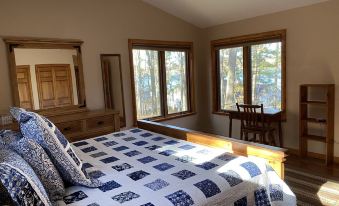 CC49’s 3 private bedrooms have 1 king, 1 queen, and 2 bunkbeds (3 twin, 1 full) plus each has their own full bathroom. The bunkbeds and 3rd bath are situated in the "Garage Bunkhouse" though the bathroom here is closed during the winter months. The added "House Loft" overlooks the kitchen and living/dining rooms and has 2 twin beds up top … so seasonally, you could sleep up to 10 in total. There is also a small office for that work you may have brought with you. CC49’s full kitchen is complete with range, refrigerator, dishwasher & microwave … we also have a laundry room with a large/stacked washer & dryer. The living room and dining room have great access to our hand laid stone fireplace complete with a new insert for added heat in the colder seasons. This general family area also enjoys great views to the lake!